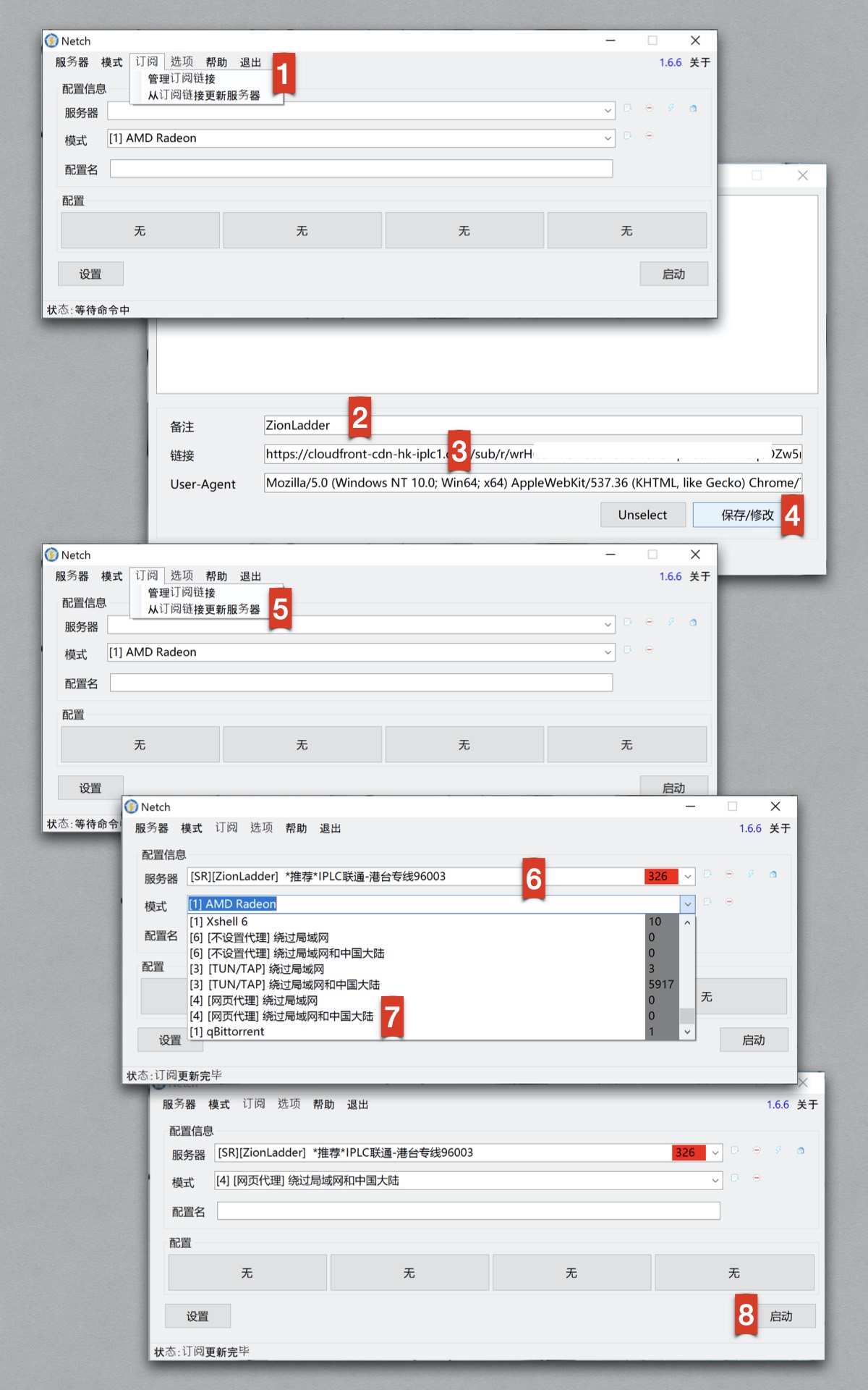 打开应用, 依次 1.菜单 -> 订阅 -> 管理订阅链接, 2,3.填写备注和订阅链接, 4.保存/修改, 5.菜单 -> 订阅 -> 从订阅链接更新服务器, 6.选择合适的(推荐)服务器, 7.选择模式 -> [网页代理]绕过局域网和中国大陆, 8.启动